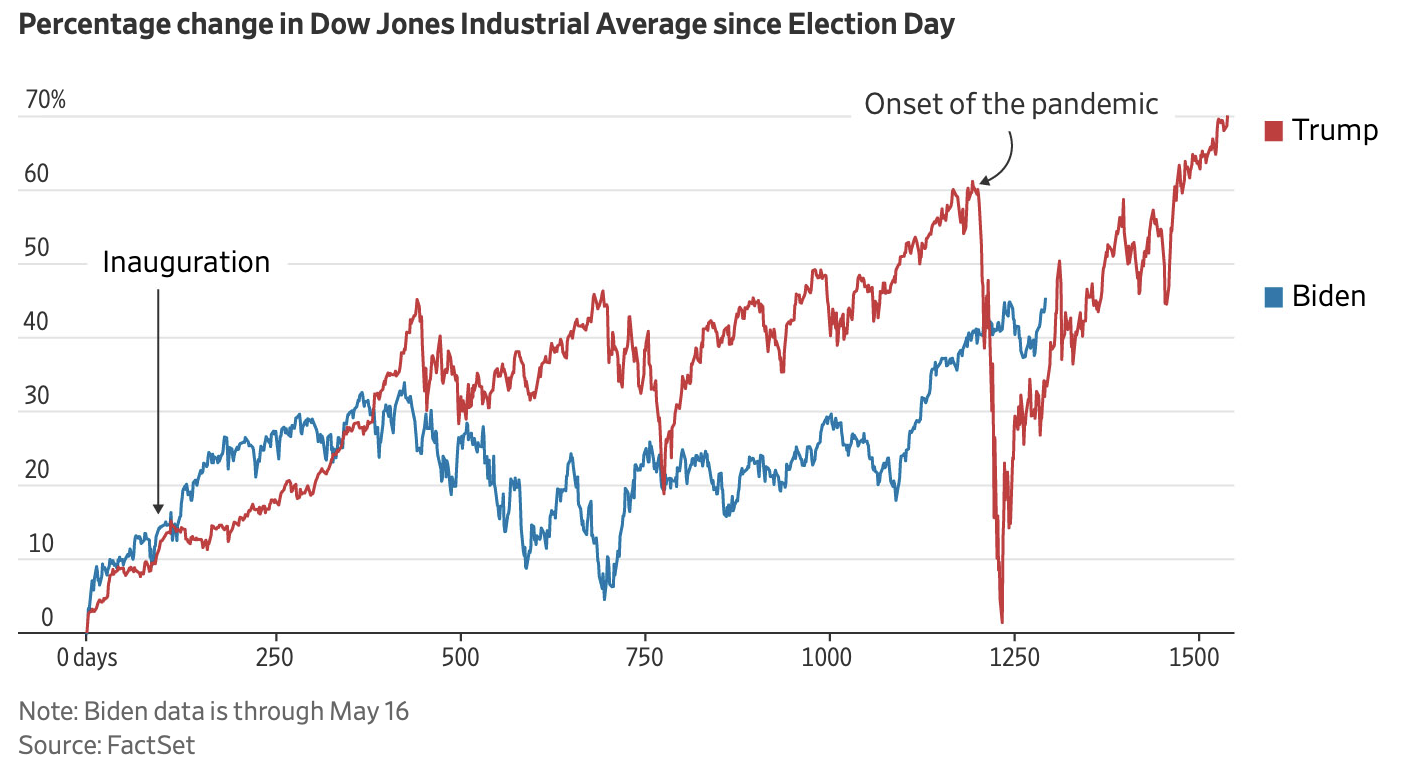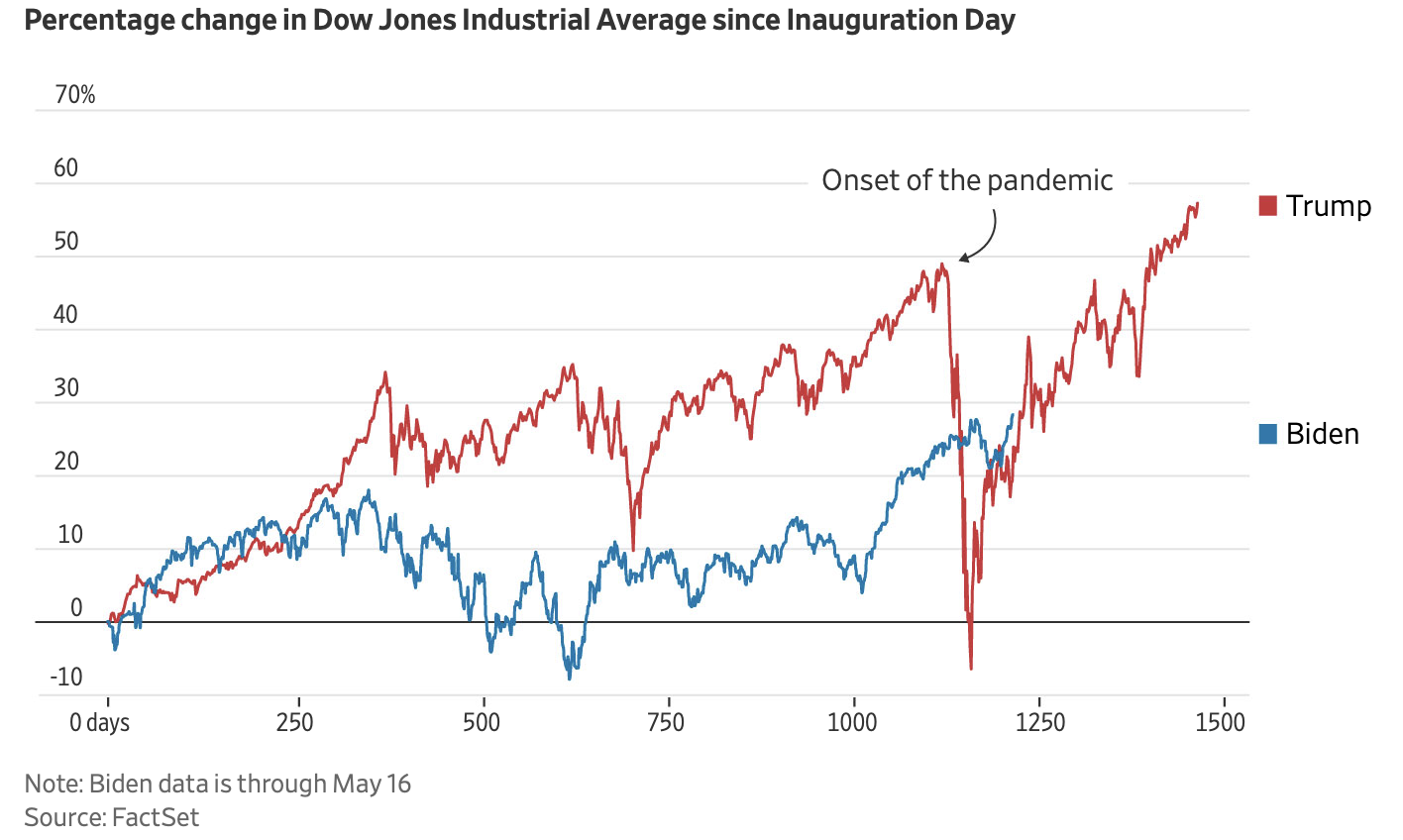 - При Тръмп: От встъпването в служба на Тръмп Dow също бележи забележителен растеж. Този интервал обаче включваше началото на Ковид пандемията, която докара до внезапен спад на пазара, последван от устойчиво възобновяване, подхранвано от интервенциите на федералните управляващи и Федералния запас. До края на мандата на Тръмп Dow се беше нараснал с 57% от деня на встъпването му в служба.