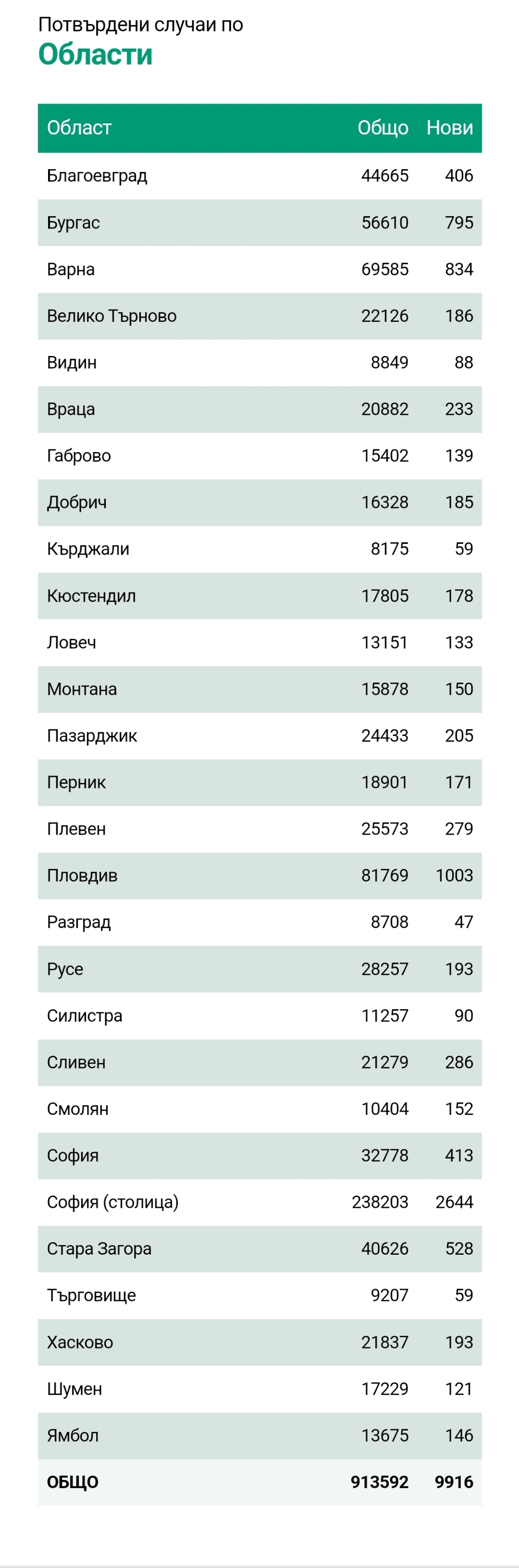 София със своите 2644 нови случая продължава да държи първото място, следват Пловдив – 1003, Варна с 834 и Бургас – 795 инфектирани за ден.