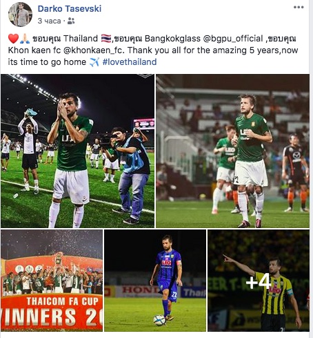 Македонският халф Дарко Тасевски се сбогува с Тайланд. " Благодаря на всички за невероятните пет години, в този момент е време да се завърна вкъщи ", написа Тасевски в своята страница във Facebook. Както е известно, плеймейкърът се контракти със Славия, като се завръща в Първа лига. Той се чака да дойде в Турция до няколко дни, с цел да стартира тренировки с " белите ", които са на предварителен лагер в Анталия. Бившият национал на Македония игра в Левски пет сезона сред 2007 година, и 2012 година, с който завоюва купата и две Суперкупи на България. На " Герена " той записа 144 мача и 23 гола.