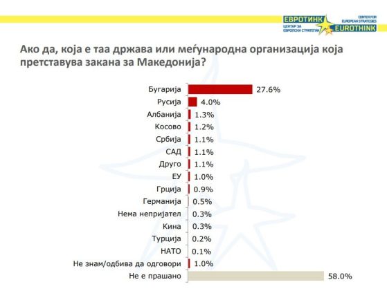 Отговорите на тези, които считат, че има страна или интернационална организация, която съставлява опасност за Северна Македония, се подреждат по този начин: България - 27,6%, Русия - 4%, Албания - 1,3%, Косово - 1,2%, Сърбия - 1,1%, Съединени американски щати - 1,1%, Европейски Съюз - 1%, Гърция - 0,9%.