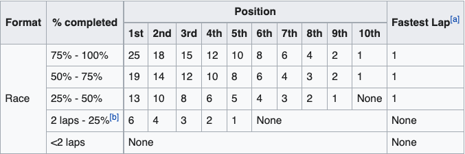 Причината е, че те бяха основани за надпревари, които биват прекратени с червен байрак, без значение от повода, и не биват възобновени по-късно. В случая в Япония имаше червен байрак, само че след повече от 2 часа закъснение конкуренцията бе рестартирана и приключи с кариран байрак. Това значи, че на водачите се дава цялостният набор от полагащите им се точки, т.е. 25 за спечелилия, 18 за втория, 15 за третия и по този начин до 1 за десетия.