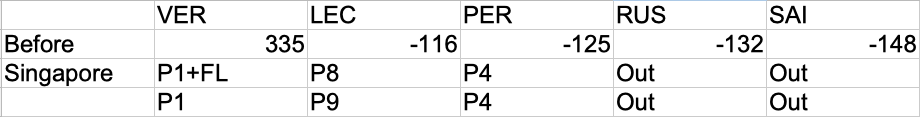 Простата математика демонстрира, че с цел да стане първенец цели пет кръга преди края на акцията водачът на Ред Бул ще би трябвало да завоюва с 22 или повече точки повече от Леклер на „ Марина Бей “. Това на практика задължава настоящият притежател на купата да се качи на най-високото ходило на подиума, а Леклер да приключи в дъното на топ 10.