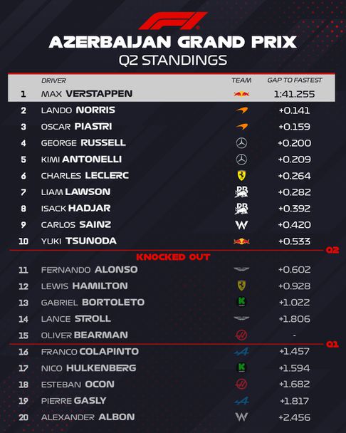 Трети ще потегли Лоусън, който остана на 0.590 зад Верстапен, а до него на втората редица ще застане Андреа Кими Антонели, който беше със единствено 0.010 по-бавен от новозеландецът. Джордж Ръсел и Юки Цунода ще оформят третия ред, а едвам седми ще започва Ландо Норис, който беше първи на пистата във финалните летящи турове и изостана с 1.122 от Верстапен. По-бавен от него беше единствено Хаджар, който ще започва осми пред блъсналите се Пиастр и Леклер.