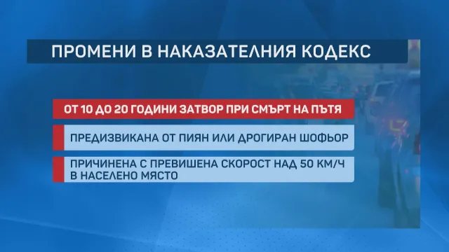 Те одобриха наказването при гибел на пътя, провокирана от пийнал, дрогиран или с превишена скорост да е от 10 до 20 години затвор, вместо сегашните от 5 до 20 години, написа БТВ.