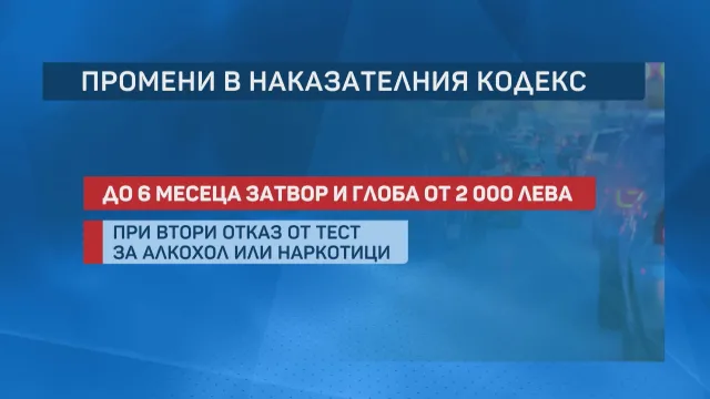Също по този начин се криминализира вторият отвод от тест за алкохол и опиати. При такова нарушаване се планува до 6 месеца затвор и санкция от 2000 лв..