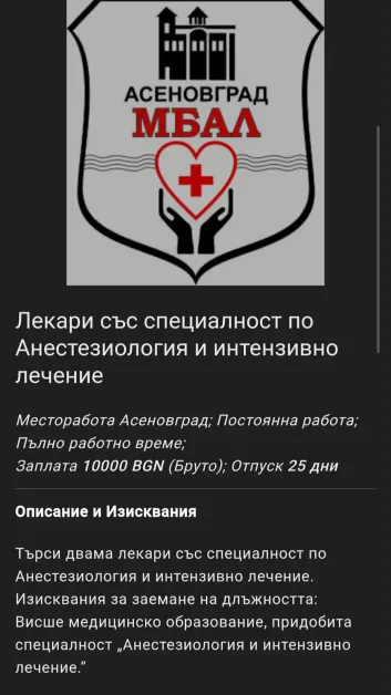 „ Обявата стои от два месеца и не можем да намерим лекари. Има доста преглеждания, само че се обадиха единствено няколко сътрудници, които към този момент работят другаде и желаят да дават по 3–4 наряди на месец. Но това не е вид за нас – трябват ни хора на цялостен работен ден “, изясни пред TrafficNews доктор Мария Даракчиева, шеф на МБАЛ „ Асеновград “.
