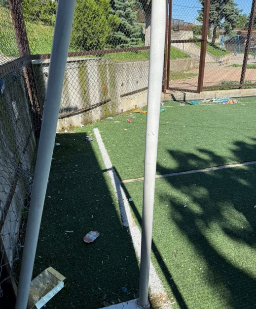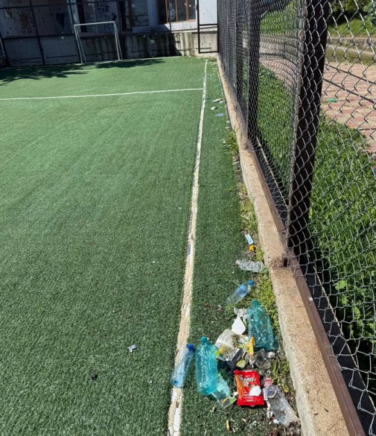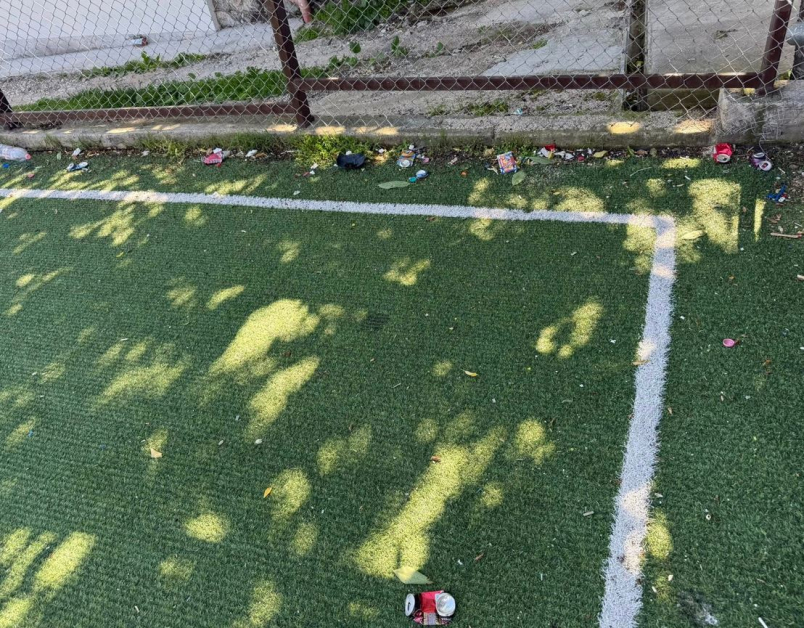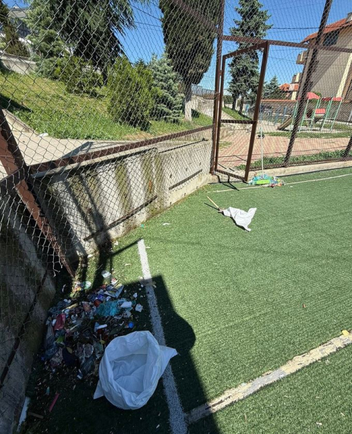 Снимките, направени на терена преди почистването, демонстрират тъжна действителност – тревожна панорама с разпилени пластмасови бутилки, опаковки от храни, железни кенове и боклуци, насъбрани по краищата на спортната площадка. Въпреки съществуването на панер за отпадък, отпадъците се натрупат безконтролно към него.