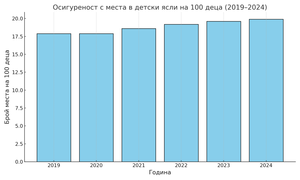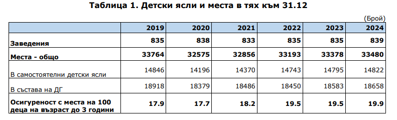 Броят на децата в яслите понижава, регистрират още данните. Динамиката е следната – от 32 185 през 2019 година до 30 367 през 2024 година, като през 2022 и 2023 година се следят дребни пикове.