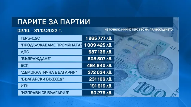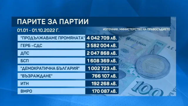 От 1 януари до вота на 2 октомври най-вече пари от хазната е взела обединението " Продължаваме промяната " – малко над 4 млн. лв.. Следващите са ГЕРБ-СДС – с над 3,5 млн. лв.. Следват ДПС, БСП и " Демократична България ".