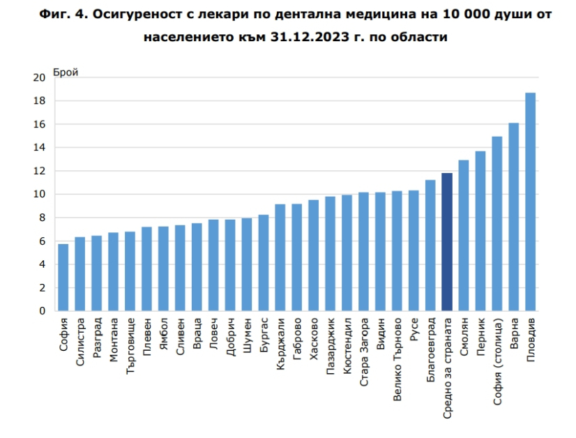 Област Пловдив обаче е преди всичко по брой експерти в региона на денталната медицина . Тук на 10 000 души се падат 18,7 лекари, или другояче казано на един ортодонт би трябвало да обслужва 534 пациенти. В статистиката следва област Варна, където също има развита просветителна конструкция в сферата. Там коефициентът е 16.1 на 10 000. На трето и четвърто място са София град (14.9) и Перник (13.7). Най-ниска е осигуреността на популацията с лекари по дентална медицина в областите София (5.7), Силистра (6.3), Разград (6.5) и Монтана (6.7).