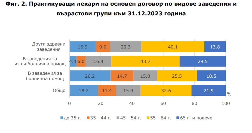 Разпределението на практикуващите лекари по възрастови групи и типове заведения демонстрира, че максимален е делът на младите лекари на главен контракт в болнични заведения (26.2%), а минимален - в заведенията за извънболнична помощ (4.4%). Повече от две трети от лекарите на главен контракт в заведенията за доболнична помощ са на възраст над 55 години (73.2%).
