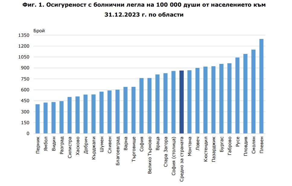 На този декор, осигуреността на популацията с болнични кревати към края на 2023 година е 864.5 на 100 000 души от популацията. Иначе казано на 115 пациенти се пада по едно легло. Най-високи са стойностите на индикатора в областите Плевен (1 297 на 100 000), Смолян (1 150) и Пловдив (1 092), а най-ниски са в областите Перник (402), Ямбол (425) и Видин (432).