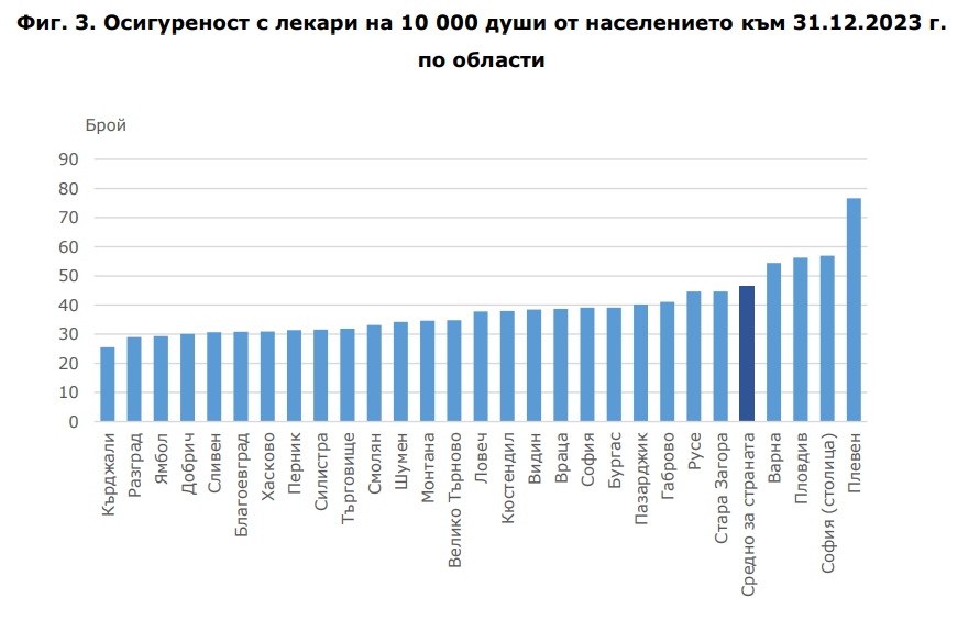 На второ място в статистиката е столицата с 56.9 на 10 000, а отличник с класацията е Плевен, където на 10 000 души се падат 76,7 лекари. Всъщност това са и областите, където има централизация на медицински университети и академични лечебни заведения, което въздейства на данните. Най-нисък е индикаторът за областите Кърджали (25.5 на 10 000 души от населението), Разград (29.0), Ямбол (29.3) и Добрич (30.1).