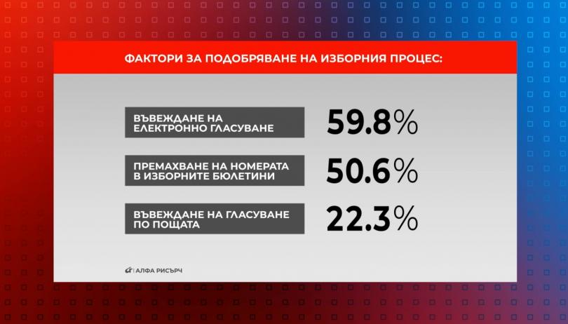 Малко над 60% от интервюираните в представителното изследване на " Алфа Рисърч " за предаването " Референдум " утвърждават предлаганите промени в изборния развой, 29 на 100 дават негативен отговор, а малко над 10% нямат мнение.