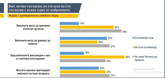 Прави усещане и високият дял на българи, които одобряват, че наложителната имунизация е част от международна интрига – 18% (близо 1 млн. българи). Близо половината от пълнолетното население са на противоположната позиция. И на това изказване се резервира висок делът на тези, които показват, че „ не знаят/ не могат да преценяват " (34%).