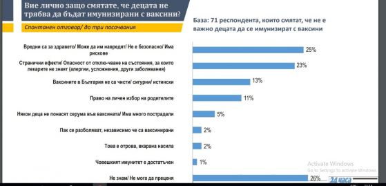 Малко над един милион българи считат, че имунизациите не са безвредни. Около милион българи мислят, че имунизациите са част от международна интрига. В същото време, близо три-четвърти от всички пълнолетни българи са на мнение, че родителите, които не ваксинират децата си, постъпват безконтролно.