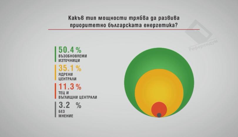 Малко над 50% от запитаните считат, че българската енергетика би трябвало предпочитано да се развива посредством възобновими източници, към 35 на 100 - посредством нуклеарни централи, а над 11% - от ТЕЦ-ове и въглищни централи.