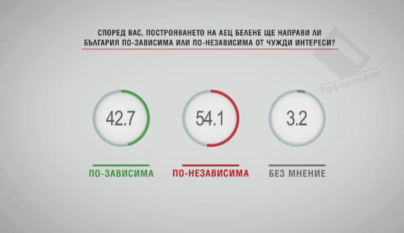 Според 54% от интервюираните построяването на АЕЦ " Белене " ще направи страната ни по-независима от непознати ползи, а близо 43 на 100 - по-зависима.