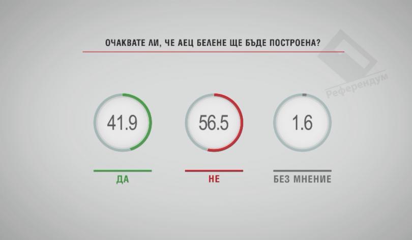 Малко над 56 на 100 от запитаните не чакат, че АЕЦ " Белене " ще бъде издигната, а близо 42 на 100 са дали позитивен отговор.