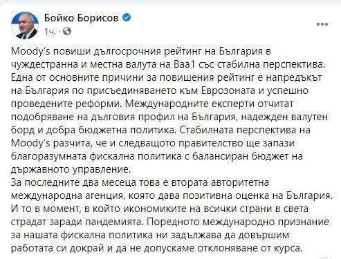 Малко след като Moody’s увеличи дълготрайния рейтинг на България в задгранична и локална валута на Baa1 със постоянна вероятност, министър председателят Бойко Борисов изрази задоволството си от този факт и означи, че интернационалните специалисти регистрират напредъка на България. Според него това задължава държавното управление да довърши работата си до дъно.