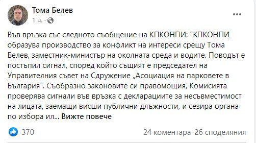 Във връзка със следното известие на КПКОНПИ: " КПКОНПИ образува произвеждане за спор на ползи против Тома Белев, заместник-министър на околната среда и водите. Поводът е постъпил сигнал, съгласно който същият е ръководител на Управителния съвет на Сдружение „ Асоциация на парковете в България “. Съобразно законовите си пълномощия, Комисията ревизира сигнали по отношение на декларациите за несъответственост на лицата, заемащи висши обществени длъжности, и сезира органа по избора или назначението им за предприемане на нужните дейности. "