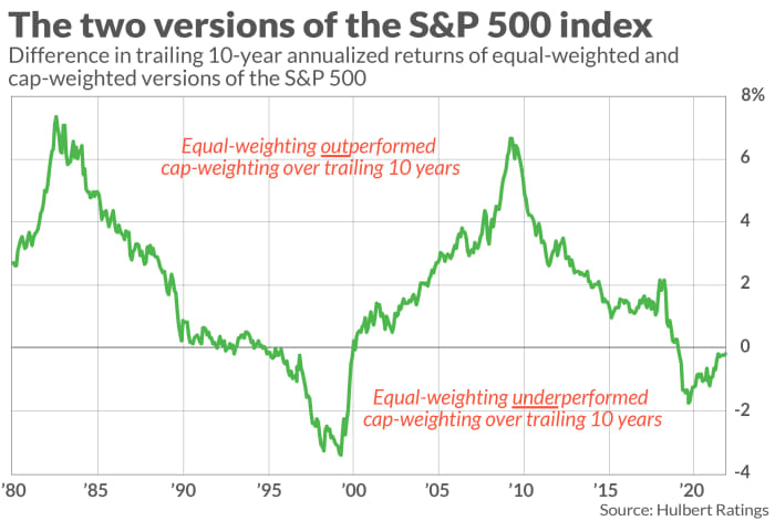 Този внезапен контрастност изяснява за какво версията с еднообразно тегло на показателя S&P 500 надмина обичайна, претеглена по пазарна капитализация версия на показателя – версията, която виждате да се оповестява всеки ден във финансовата преса. Стратегията за равно тегло дава на всяка от съставните акции на показателя еднообразно тегло в показателя, до момента в който методът с претеглено ограничаване класира всяка акция съгласно нейната пазарна стойност. Като се има поради, че акциите, представляващи повече от една четвърт от показателя S&P 500, са изгубили повече от три пъти междинната стойност за всички останали съставни елементи, не е изненада, че възвръщаемостта на S&P 500 от началото на годината е надалеч зад тази на равнопретеглената версия — с 6,0 процентни пункта.Това е най-голямата алфа за версията с еднообразно тегло от повече от десетилетие, в случай че приемем, че тази разлика от 6,0 процентни пункта издържи до края на годината. Трябва да се върнете до 2010 година, с цел да намерите друга календарна година, в която алфата с еднообразно тегло е била по-голяма. По това време алфата беше 6,3 процентни пункта.Версията с еднообразно тегло на показателя, несъмнено, не постоянно превъзхожда версията с претеглено ограничаване. Дългосрочните данни рисуват картина на двете версии във виртуално тъждество. От 1971 година, колкото обратно S&P Global е пресметнал представянето на версията с еднообразно тегло, версията с еднообразно тегло е донесла възвръщаемост, поправена по отношение на дивидентите, от 12,2% на годишна база, за разлика от 10,8% за версията с претеглена капитализация. Но по-високата възвръщаемост на версията с еднообразно тегло беше получена с 13% повече волатилност, което е една мярка за риск. На основата на поправяне на риска, двете са съвсем идентични, по представянето си, с малко напред за показателя с еднообразно тегло.Това леко преимущество значително изчезва, откакто се вземат поради транзакционните разноски и разноските за ръководство. Транзакционните разноски са по-високи за версията с еднообразно тегло, защото по дизайн тя би трябвало да претърпи повече периодически транзакции за ребалансиране, в сравнение с версията с лимитирано тегло. Лорънс Тинт, някогашен основен изпълнителен шеф на Barclays Global Investors в Съединени американски щати, организацията, основала iShares (сега част от Blackrock), има вяра, че е въпрос коя скица за претегляне ще се оправи по-добре през идващите десетилетия. В изявление Тинт сподели, че ще има моменти, когато акциите с най-голяма капитализация ще пострадат непропорционално, като тази година, и когато това се случи, версията с капитализация ще изостава от версията с равно тегло. Но, добави Тинт, ще има и други моменти, когато е тъкмо противоположното.Тинт сподели, че не знае никаква теоретична причина, заради която относителното преимущество би трябвало постоянно да върви в едната или другата посока.Аргументът на Тинт получава историческа поддръжка от графиката нагоре, която разказва разликата в последващите 10-годишни годишни възвръщаемости на версията на S&P 500 с еднообразно тегло и финансово тегло. Тази разлика се колебае сред интервали на предимство и по-слабо показване с еднообразно тегло. Имайте поради, че тези възвръщаемости се пресмятат въз основа на теоретичната възвръщаемост на самите показатели и н