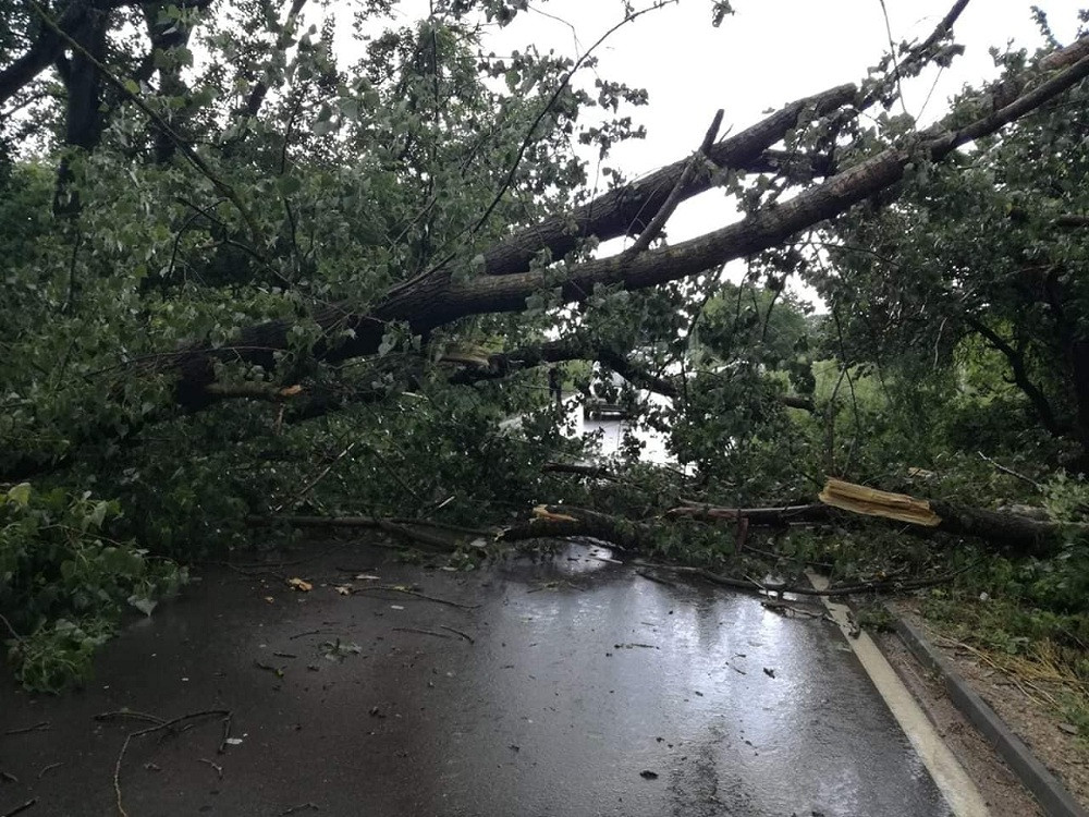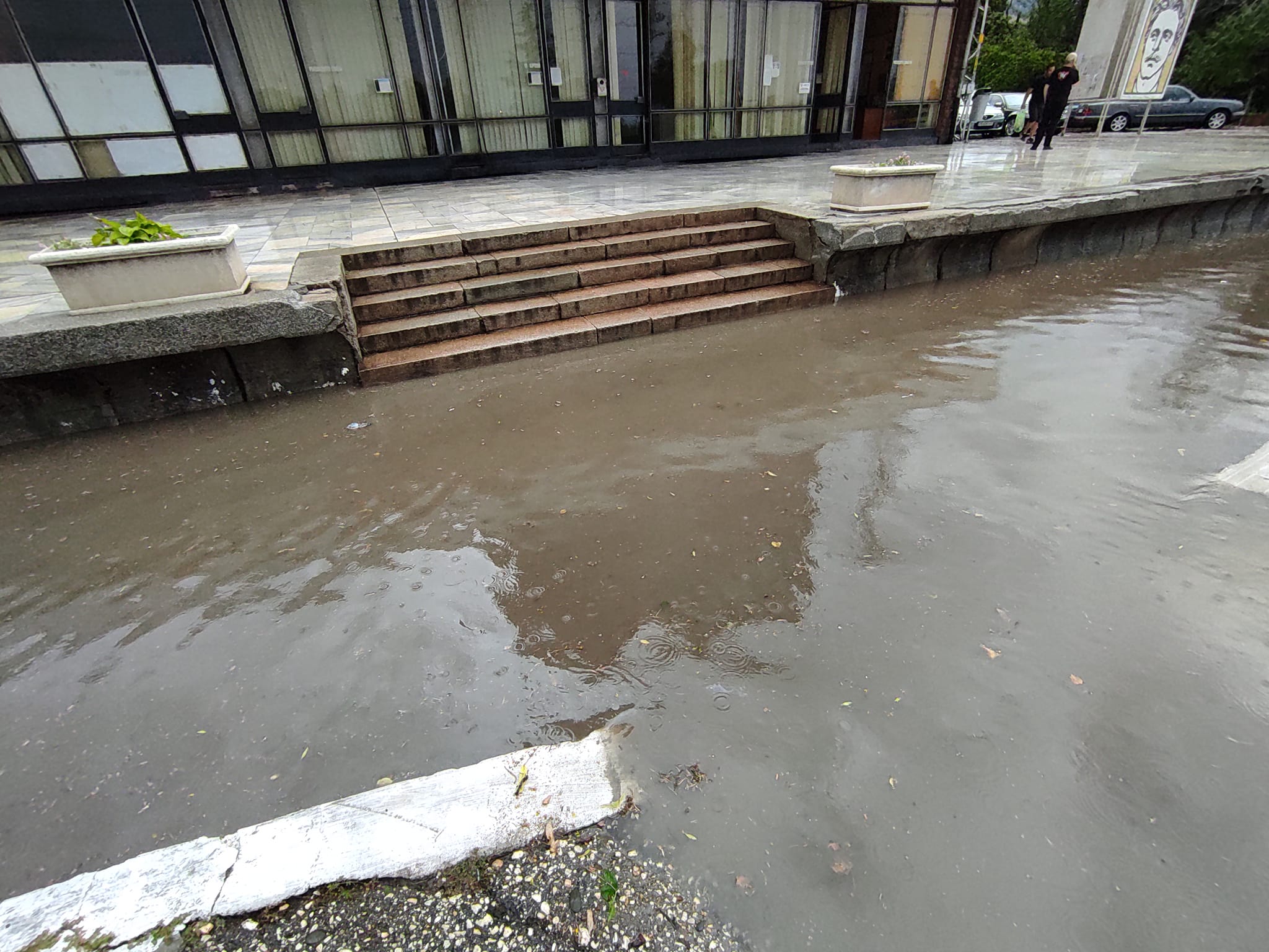 В Карлово са се наводнили изби и приземни етажи. Силният вятър е повалил дърво върху лек автомобил пред някогашната постройка на съда.