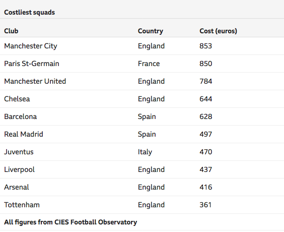 Показателно е, че всеки от отборите, приключили на първите шест места в Премиър лийг, влиза в десетката на въпросната ранглиста. Челси е на четвърто място, а Ливърпул, Арсенал и Тотнъм са надлежно осми, девети и десети.