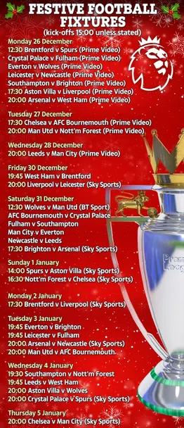 Битката в Премиър лийг се възобновява на 26 декември с обичайния кръг на „ Боксинг дей “. Това е осем дни след финала на Мондиал 2022. Програмата демонстрира, че Ливърпул и Манчестър Юнайтед ще би трябвало да изиграят по три мача в границите на 168 часа. За съпоставяне – Арсенал и Манчестър Сити ще имат 24 часа повече, с цел да изиграят същия брой срещи. Тотнъм и Челси пък ще разполагат с към 55 часа повече за почивката, тъй като сред първия и последния им мач в този празничен интервал, в който ще се изиграят три кръга, има разстояние от повече от девет дни.