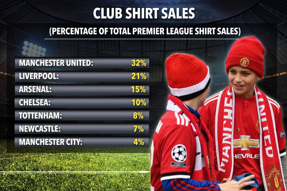 Манчестър Юнайтед продължава да бъде клуба, който продава най-вече фланелки на територията на Англия. Това демонстрират данните от най-големия магазин за спортни артикули Sports Direct. " Червените дяволи " са надалеч пред конкуренцията с 32% дял от всички продадени фланелки на тимовете от Премиър лийг. Второто място е за обичайно най-големия противник на Юнайтед в исторически проект - Ливърпул. Мърсисайдци заемат тази позиция с пазарен дял от 21%. Следват лондонските грандове Арсенал (15%), Челси (10%) и Тотнъм (8%).
