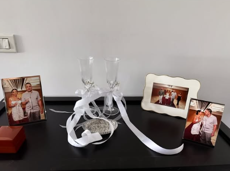 На видно място в жилището си, Мария е подредила три сватбени фотоси в рамки, две елегантни шампански чаши, обгърнати със снежнобял сатенен шлейф, и стилна сребърна табличка. Моментите, запечатани на фрагментите, демонстрират младоженците, които са като че ли принудително заставени да театралничат.