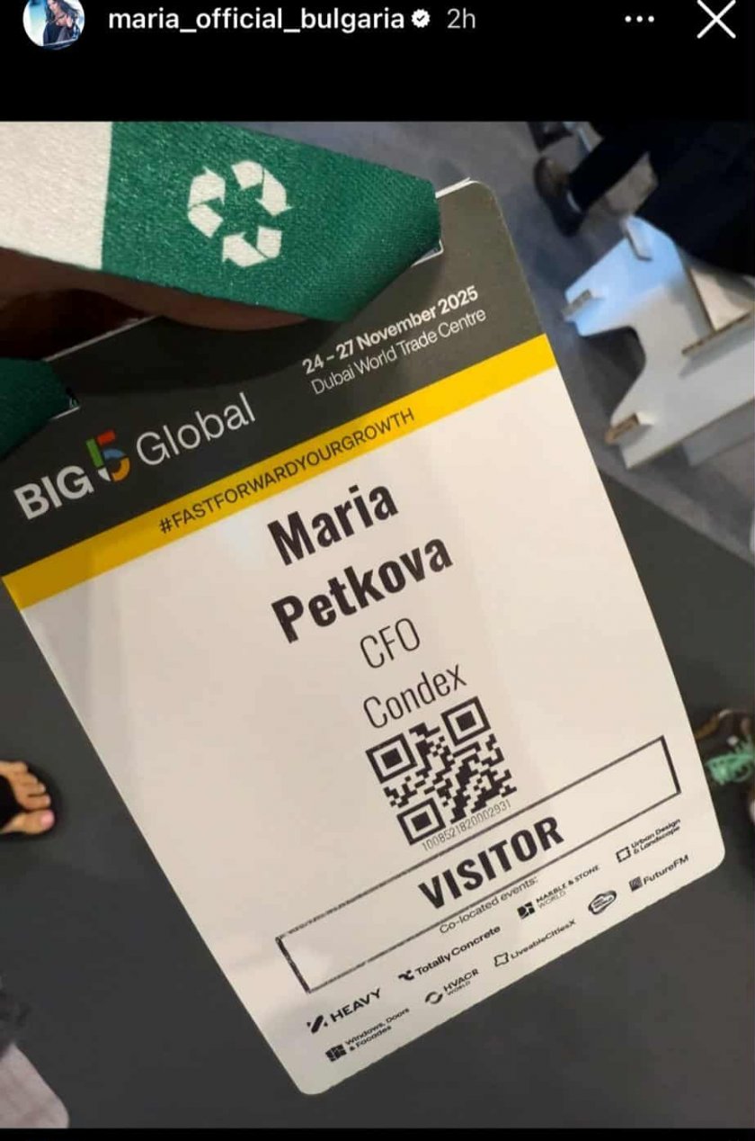 Мария се разгласи за основен финансов шеф в фамилната компания на мъжа си „ Кондекс “, която се занимава с импорт на климатици. Фолк дивата придружи брачен партньор № 4 Теодор Петков на бизнес събитие в Дубай, където гордо се похвали, че участва като представител на компанията на своя брачен партньор. А с цел да няма подозрения, тя демонстративно сподели и баджа си, като остави почитателите си да разискват елементи и догадки до сутринта, видя Lupa.bg. Мария е на позиция CFO, което е съкращението на „ chief financial officer “.