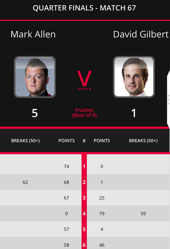 Марк Алън завоюва трагично борбата с Нийл Робъртсън през вчерашния ден с 5:4, а в този момент даде единствено фрейм на Гилбърт в биткаджийски дуел без доста огромни точкови серии. Пистолета обаче още веднъж показва темперамент и не престана методично да преследва крайния триумф, за което бе заплатен с полуфинал на ранкинг шампионат за първи път от Откритото състезание на Уелс 2016.