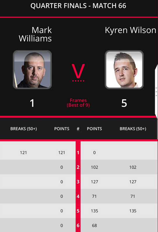 Уелския змей, притежател на “Тройната корона” и повторен международен първенец, бе изгубил единствено един фрейм досега в World Open, като стартира с чудесна серия от 121 точки в първата партия против Уилсън. Само че това се оказаха единствените му попадения в мача, тъй като в идващите пет фрейма той не вкара нито една топка. Уилсън бе основният провинен за това, тъй като се възползваше от всичките си шансове и направи внушителни брейкове от 102, 127, 71 и 135, като в шестия фрейм резултатът също бе 68-0 в негова изгода.