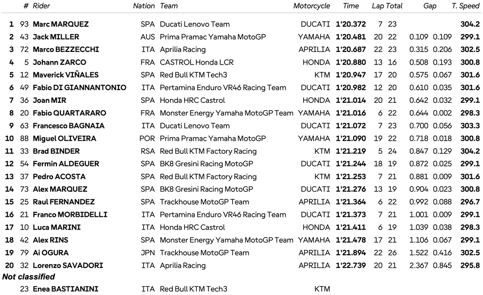 Нови гуми в заключителните минути сложиха още Марко Бедзеки, Йоан Зарко и Маверик Винялес, които оформиха челната петица зад Маркес и Милър. Най-близко до Маркес от водачите, които изкараха цялата сесия с един комплект гуми, беше Фабио Ди Джанантонио, който изостана с 0.610 от заводския водач на Дукати и се класира шести пред Жоан Мир, Фабио Куартараро, Франческо Баная и Мигел Оливейра, които влязоха в топ 10. От тях Мир и Оливейра влязоха в десетката с нови гуми в края на тренировката.