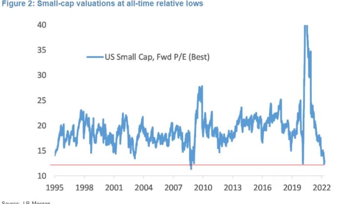 Втората му диаграма илюстрира по какъв начин акциите с дребна капитализация се търгуват при най-ниски оценки спрямо останалата част от пазара.