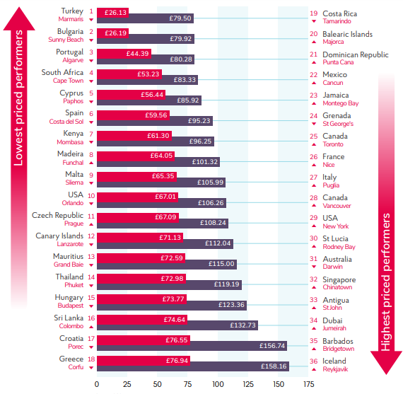 Класацията се изготвя взаимно с туристическата компания Tui съгласно цените на 8 нормални артикули по време на почивка по отношение на курса на паунда - фамилно тристепенно хранене за двама с вино, чаша кафе, бутилка локална бира, кутия кока-кола, чаша вино, бутилка газирана вода, слънцезащитен крем и репелент срещу инсекти.