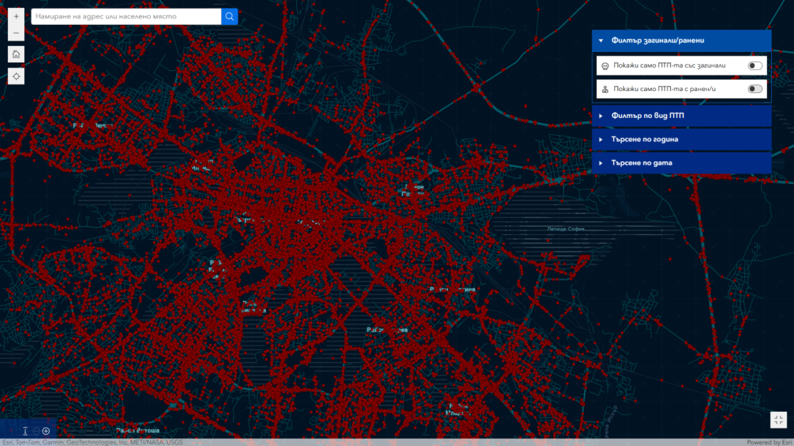 На картата има визуализирани над 177 хиляди ПТП-та. Близо 180 000 за 4 години. От тях по събрани данни 24 278 бр приключили с ранени и 1478 бр. с съдбовни случаи. Всеки случай е маркиран със съответното време и място. Но това не са просто пинчета с произшествия, а картина на натрупвани систематични проблеми, които сме приели за естествени. На нея могат да се видят кои места са най-рискови и къде се повтарят произшествия. Колко постоянно, какъв брой близо. Колко доста. Реалността в цялата си съвкупна грубост, а не изолирани единични случаи, които потъват в предишното.