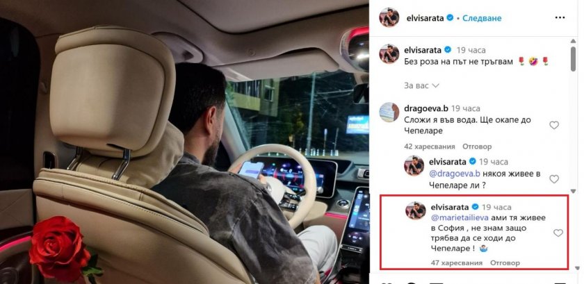 Мартин Николов за първи път си разреши да отвърне на коментар в обществената мрежа. Въпреки че финалът на шоуто към момента не е пристигнал и участниците нямат право да издават с кого са траяли живота си отвън предаването, Елвиса не се стърпя и скочи на интернет консуматор в мненията в инстаграм. Повод за полемиката стана негова фотография от колата, в която на гърба на шофьорската седалка се вижда роза. „ Без роза на път не потеглям “, написа Мартин, а изпод недоброжелател разяснява многозначително: „ Сложи я във вода, че ще окапе до Чепеларе “.