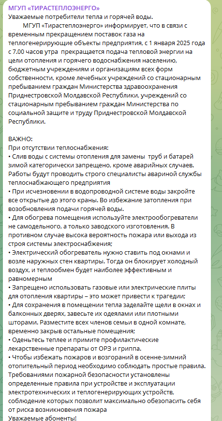 Компанията Tirasteploenergo твърди в своя телеграм канал, че прекъсването на подаването на топлогенериращи предприятия е „ краткотрайно “.