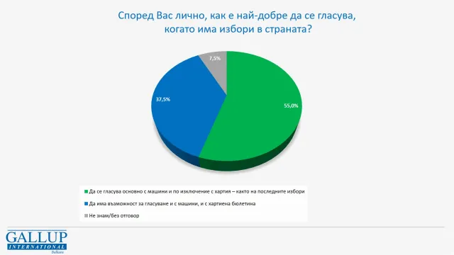 Машинният избор се оказва по-предпочитан вид за гласоподаване на избори. На въпрос за метода на гласоподаване 55% от респондентите одобряват, че е по-добре да се гласоподава главно с машини и по изключение с хартия – както на последните избори.