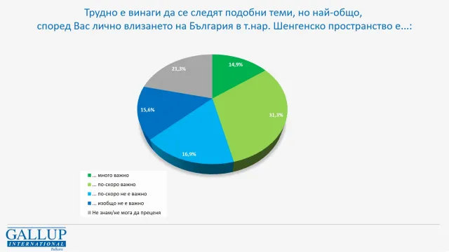46,2% от интервюираните считат, че влизането на България в Шенгенското пространство е в една или друга степен значимо. Една трета са повече или по-малко на противоположното мнение. Присъства и значителен дял – 21,3% – от респондентите, които не могат да преценяват.