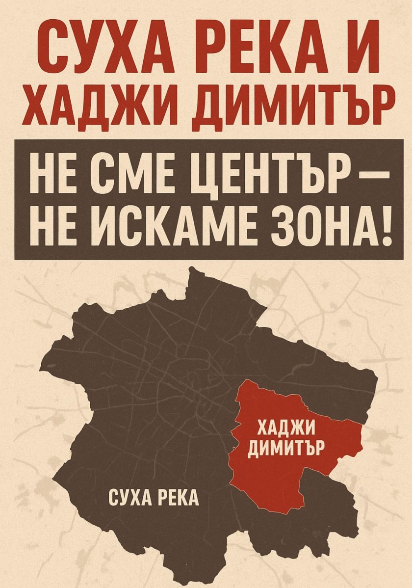 Не желаеме да плащаме, когато водим децата си на тренировки на стадиона. Това са нашите квартали, нашият живот и нашите улици!Нека бъдем единни и солидарни – споделяйте, говорете с другари и съседи, дано всички знаят какво се приготвя. Само дружно можем да покажем, че сме общественост, която мисли, работи и пази правото си на естествен живот. Суха река и Хаджи Димитър — не сме център! Искаме почитание, не ограничавания ", допълват уредниците на протестните дейности.