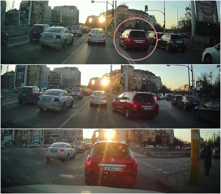 На светофар в столицата водачът, който ръководи алено " Пежо ", изненадващо напуща лентата си, с цел да продължи напряко. Водачът даже не алармира с мигач за предприемането на маневрата. По този метод той нарушава разпоредбите за придвижване по пътищата и основава евентуална заплаха за пътнотранспортно произшествие.