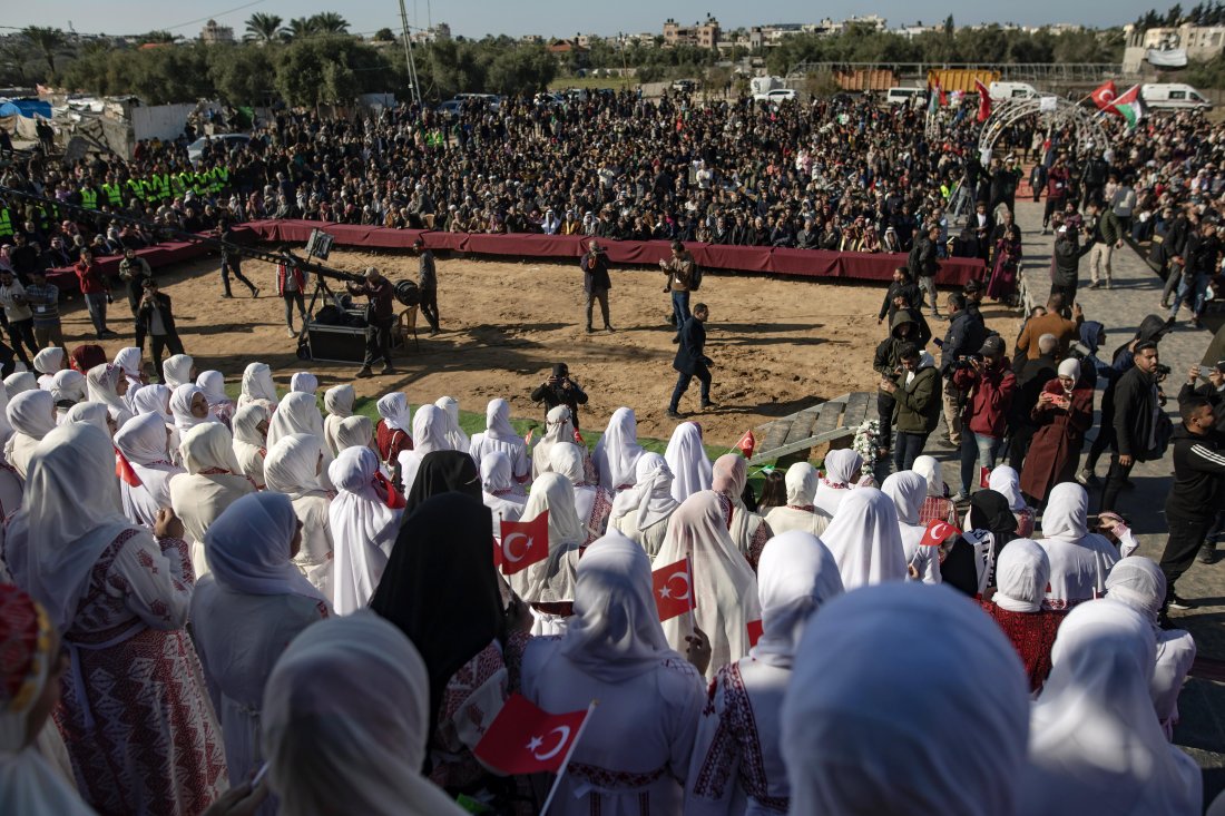 Гостите развяваха турски и палестински флагове и се радваха на осъществяването на обичаен за региона танц.