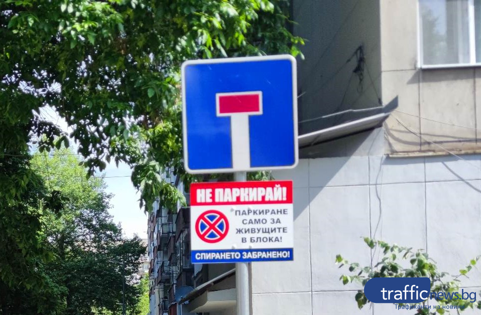 „ Не паркирай! Паркиране единствено за живущите в блока! Спирането неразрешено! ”, гласи написаното на табелата, която е сложена под пътен знак за път без излаз.