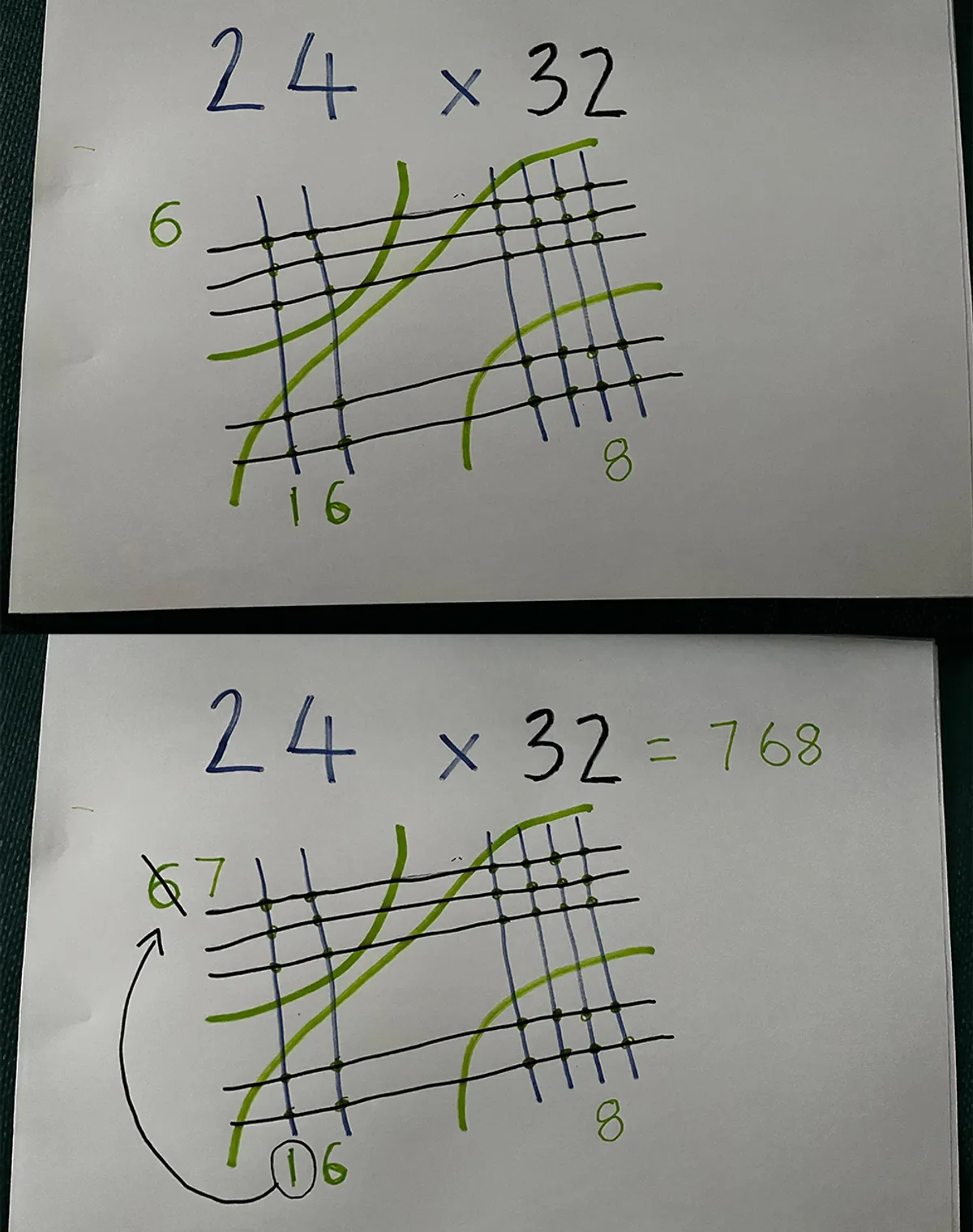 След като сте начертали втората група линии, би трябвало единствено да преброите броя на пресичащите се линии, с цел да получите резултатът от умножението. Като погледнете, евентуално можете да разберете какво се случва. На фотографията горе са начертани отвесно надлежно 3 и 2 черти, на единият множител.