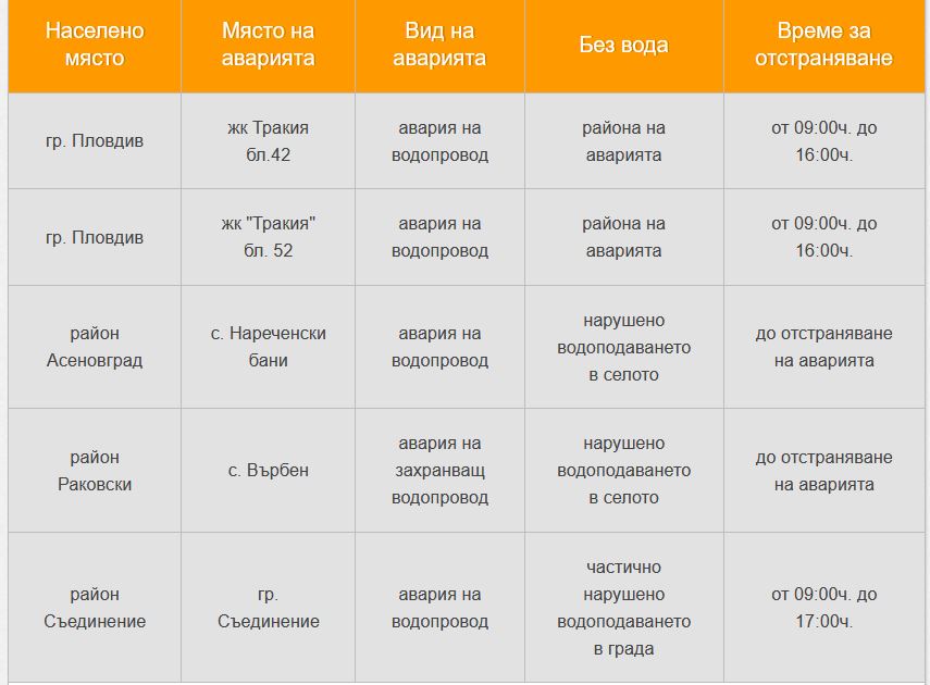 Аварии по водопреносната мрежи има и в региона. Засегнати са жителите на Нареченски бани, Върбен и в част от Съединение. Като няма посочен час по кое време ще бъде отхвърлен казусът.