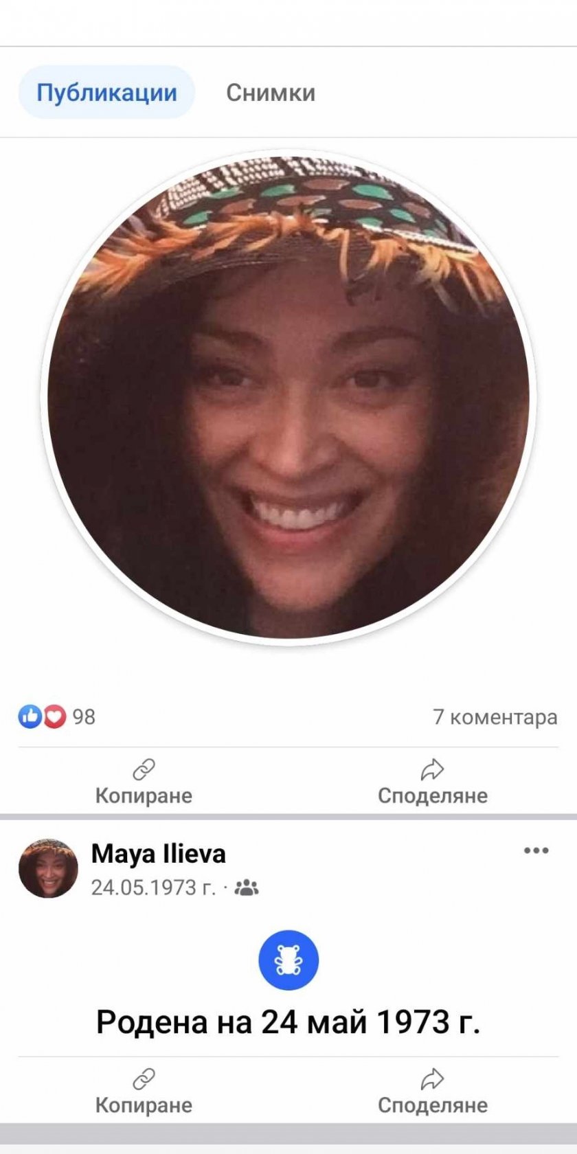 Мая Илиева най-сетне реши да излезе на ярко. Вдовицата на Георги Илиев се социализира с профил във фейсбук. Акаунтът е автентичен и зад него стои самата Мая. Тя е добавила в другари единствено най-близките си приятелки, написа в. „ Уикенд “. 51-годишната брюнетка си е поставила усмихната профилна фотография с екстравагантна шапка.