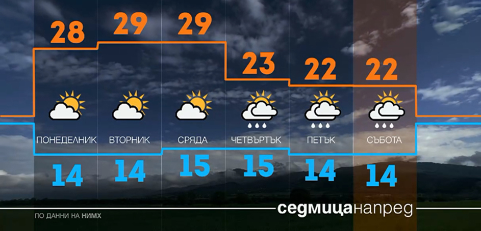 И на следващия ден температурите в най-топлите часове следобяд ще се чака да се двоумят в интервала 25 - 30 даже до към 31 градуса в всекидневно най-топлите елементи на България.